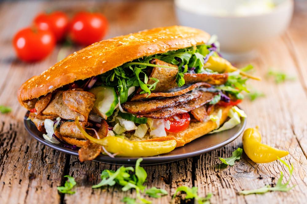 Sla, komkommer, tomaat, jalapeños, ui, knoflooksaus, sambal, champignons, rode en groene paprika, mais